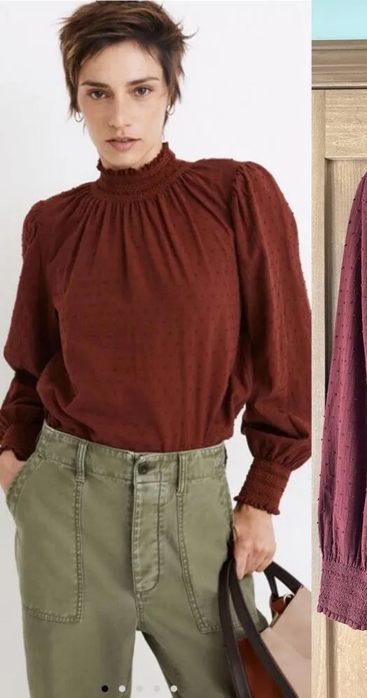 Excellent condition Madewell Rusted Burgundy Sheer-Sleeve Mockneck Long Sleeve Blouse in Clip Dot Wo... Show more