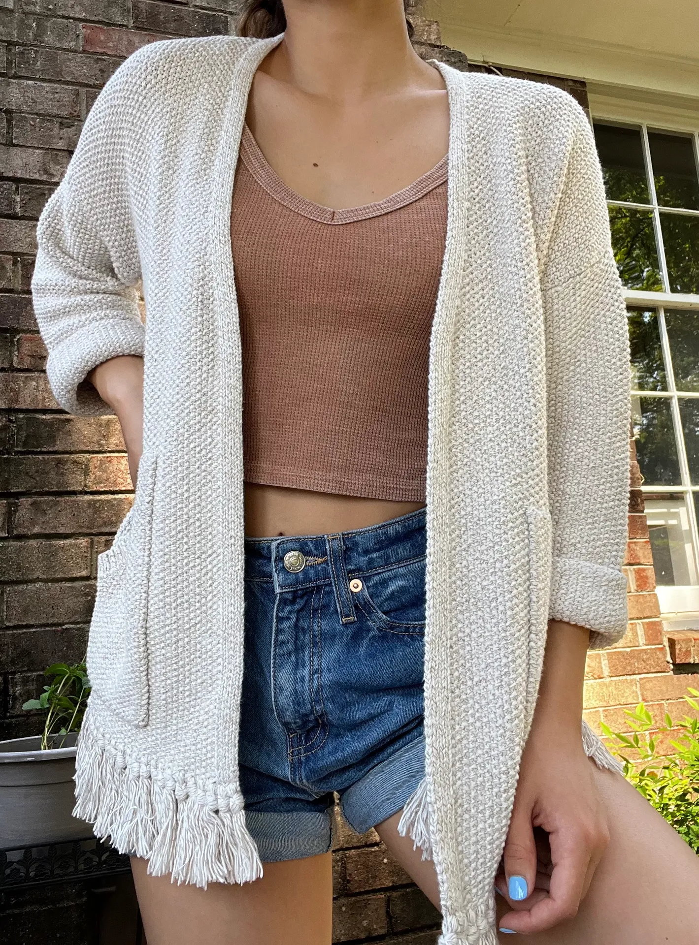 Off-white with thin brown threading throughout. Fringed ends. Two front pockets. Material is cooling... Show more