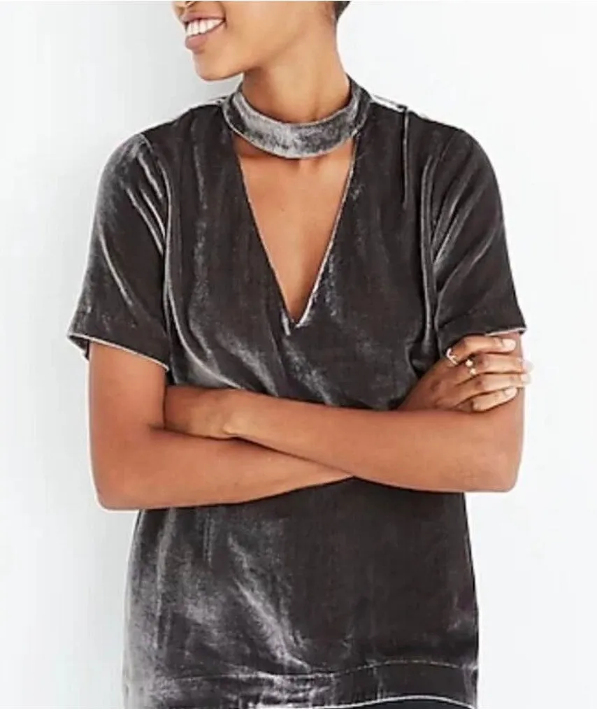 front vneck with choker collar viscose & silk blend short sleeve "dark metal" gray/green color with... Show more