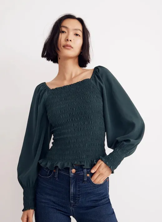 With dramatic bubble sleeves and smocking through the bodice and cuffs, this is a romantic top worth... Show more