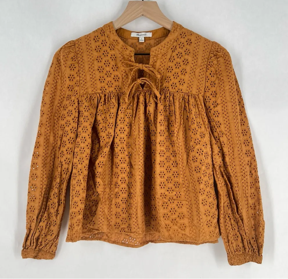 Madewell Eyelet Double Tie Peasant Top Carrot Cake 100% Cotton Size S Made of airy striped-eyelet... Show more