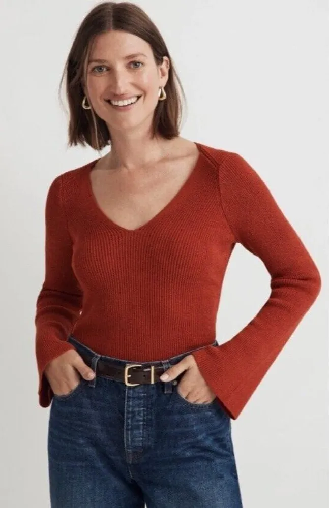 This Madewell sweater is a stylish and versatile addition to any wardrobe. The flared sleeves and V-... Show more
