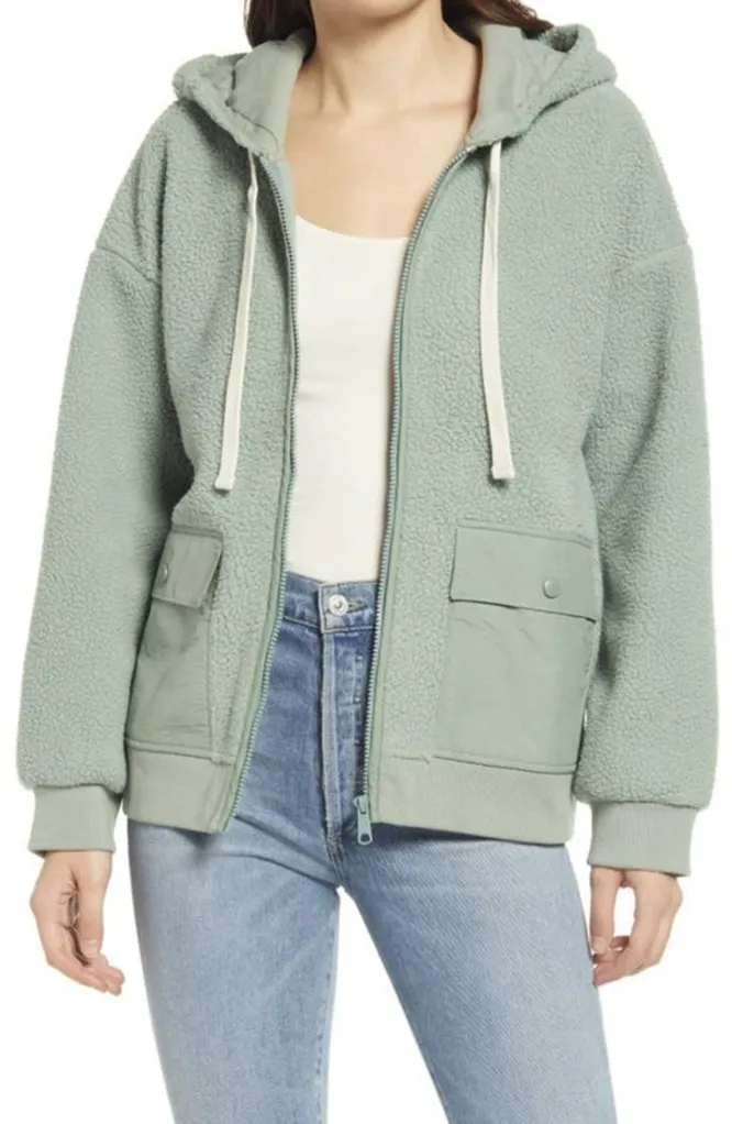 Condition- Preloved/Good Measurments- Pit to Pit 21", Length 26" Cozy Light Green/Mint Front Pockets Stay warm with this cozy green sherpa hoodie. Features a zip-up front and two pockets.