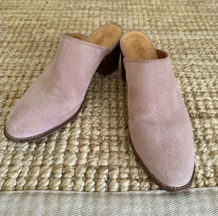 Elegant Madewell pink suede leather mules featuring a stacked block heel and slip-on design. Crafted... Show more