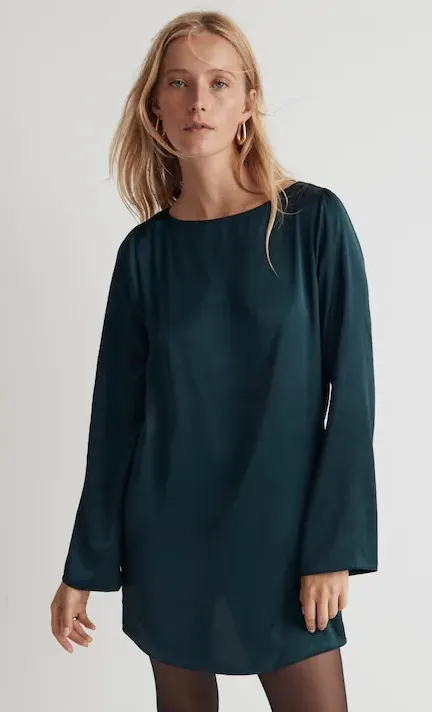 MADEWELL Long Bell Sleeve Satin Shift Dress in Smoky Spruce Size: Medium P2P: 21” Length: 33”... Show more