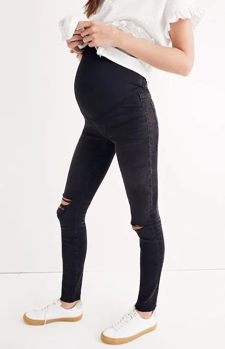 Size 27 Faded black grey color Distressing at knees Full belly panel Cotton, polyester, elastane
