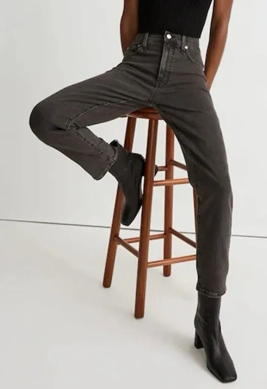 Zip fly Button closure Five-pocket style Straight leg High rise (10.5”) Rigid Clean-cut Washed black Belt loops Whiskering Approx. Measurements: Waist: 28” Rise: 10.5” Inseam: 27” Retro; Y2K; Classic; Basic; Fall; Workwear; Clean girl; Heritage; Fair Trade