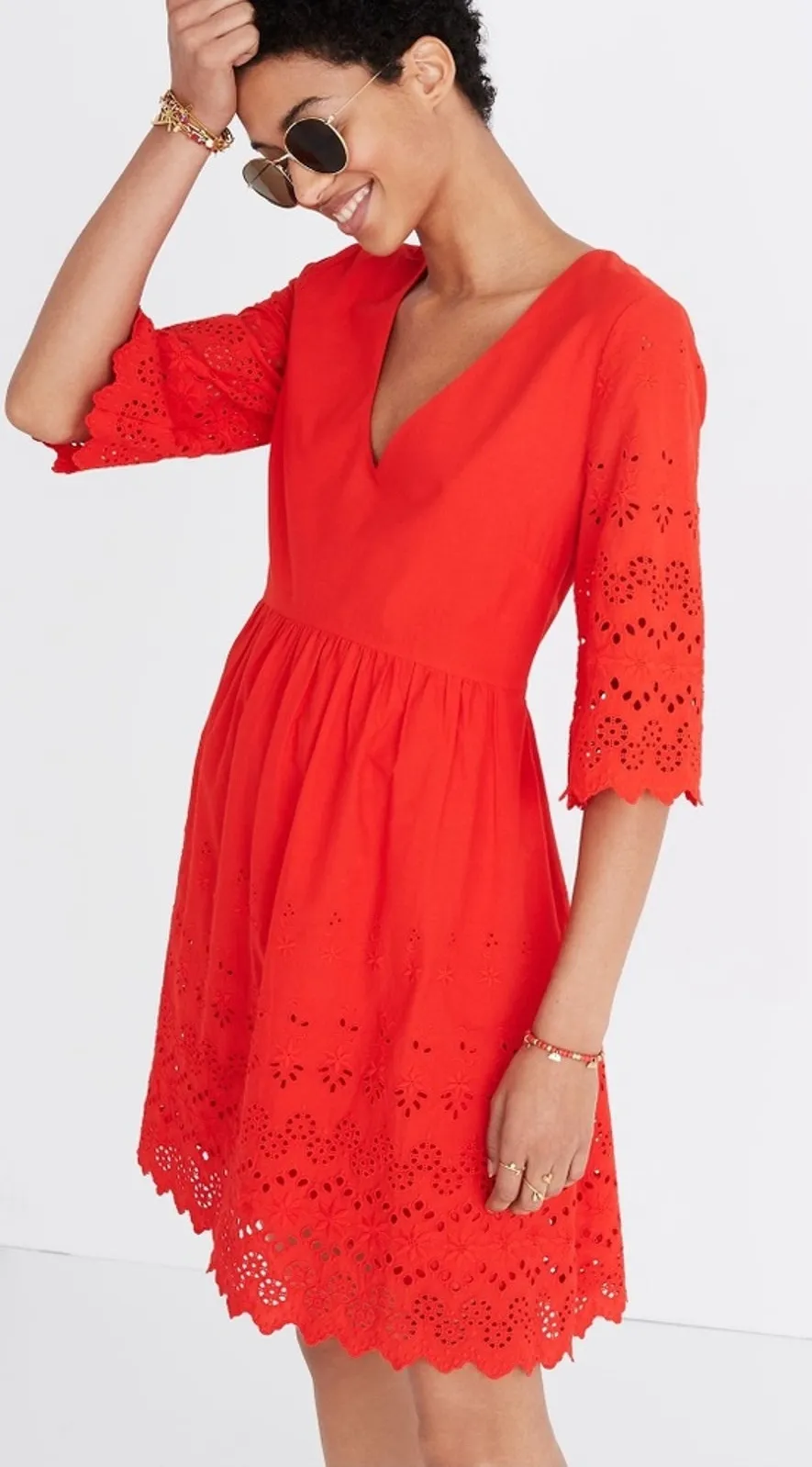 Beautiful red cotton dress by Madewell. Airy eyelet floral detailing with scalloped edges. Hidden ba... Show more