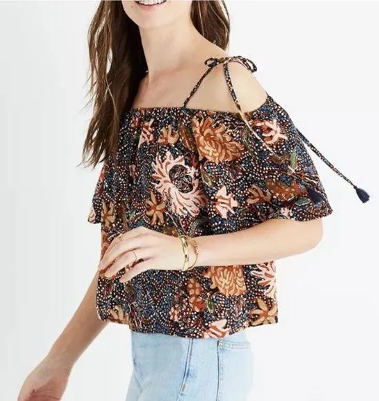Beautiful Madewell Silk Cold Shoulder Top in Sea Floral Navy blue, blush pink, olive green, tan, cr... Show more