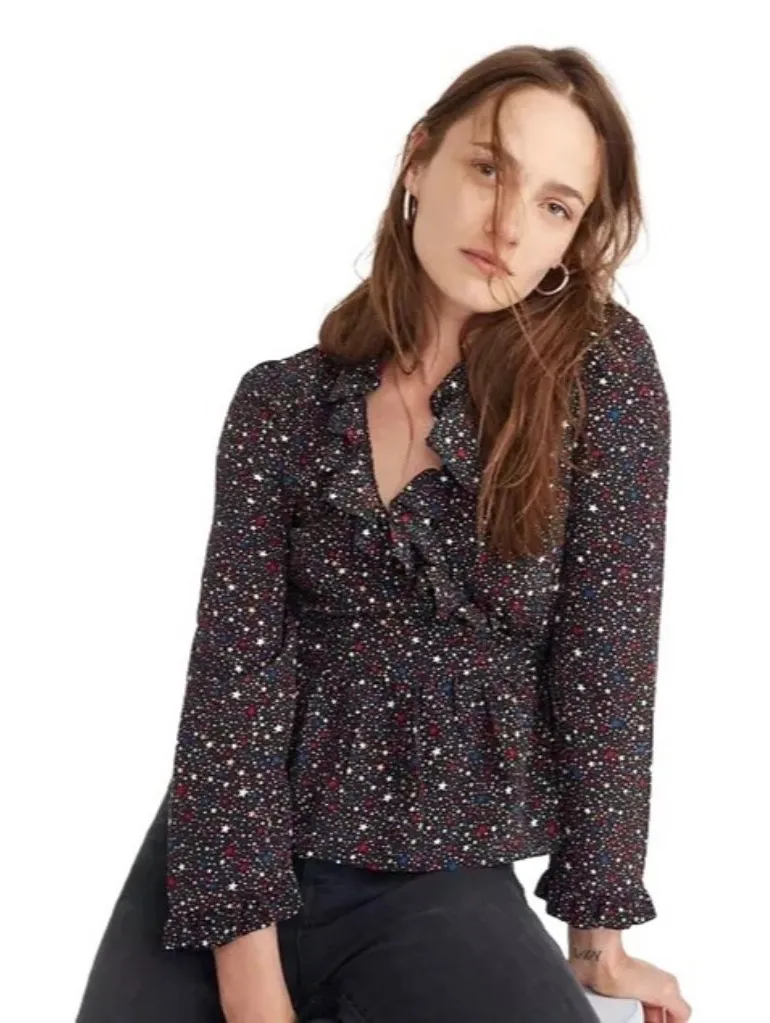 Madewell Silk Ruffle-Hem Wrap Top in Starry Night Size: Womens XXS Condition: Pre-Owned Good Feat... Show more