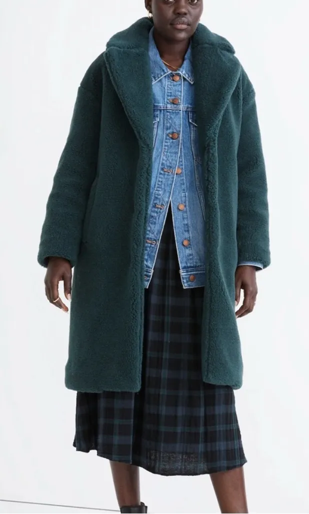 Chic teal faux fur trench coat by Madewell. Cozy and stylish for any occasion.