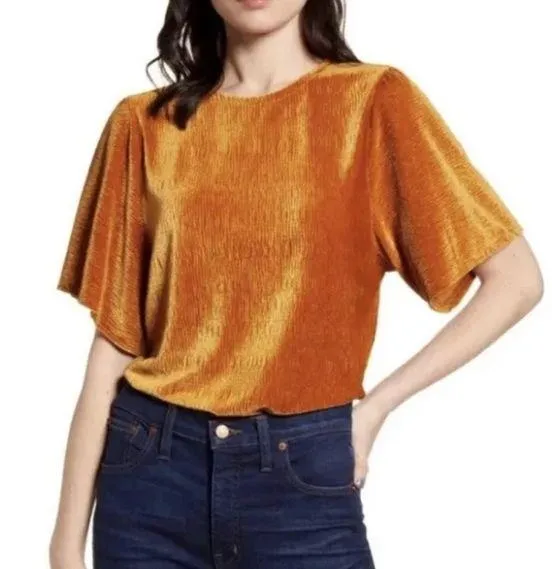 Gorgeous top with a pretty sheen to the fabric. Velvet-like with a crinkled detailing, short drapey... Show more
