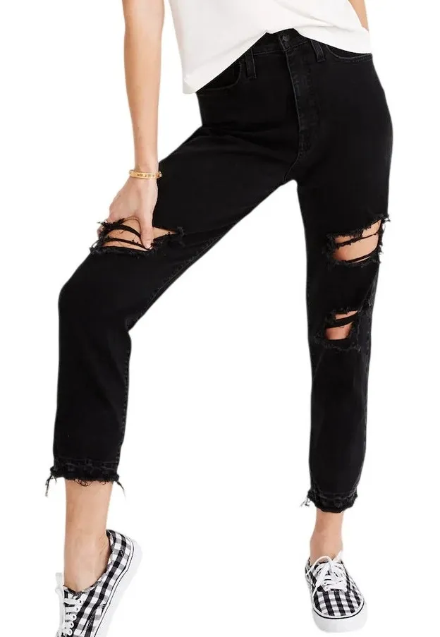 Madewell The Momjean Womens Size 29 Black Denim Distressed Knee Rip High Rise Raw Hem Streetwear St... Show more
