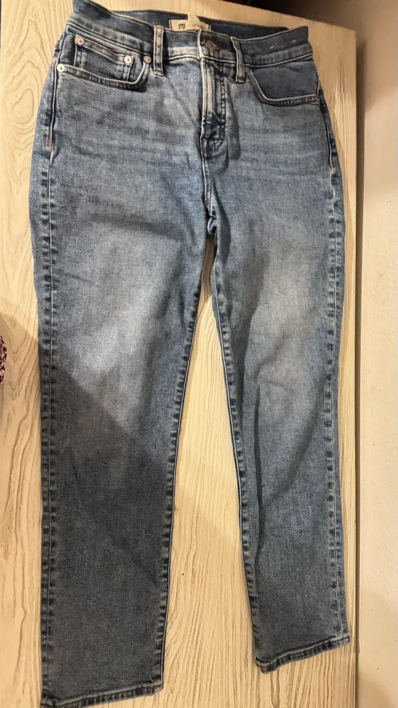 Light blue straight leg jeans. Stylish and versatile. Perfect for any occasion.