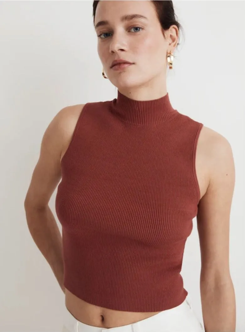 Chic brick red sleeveless top with ribbed texture. Features a stylish mock neck. Ideal for versatile... Show more