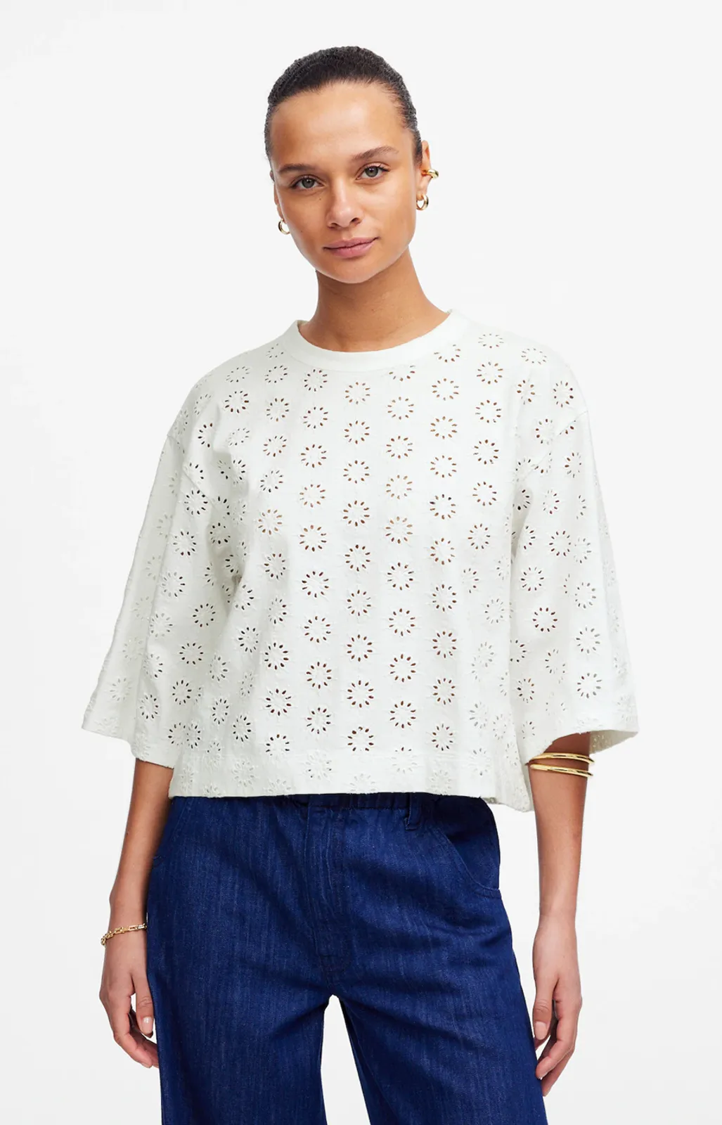 Features: crew neck, wide half sleeves, floral eyelet design, dropped shoulders, cropped length, boxy fit, white, cotton