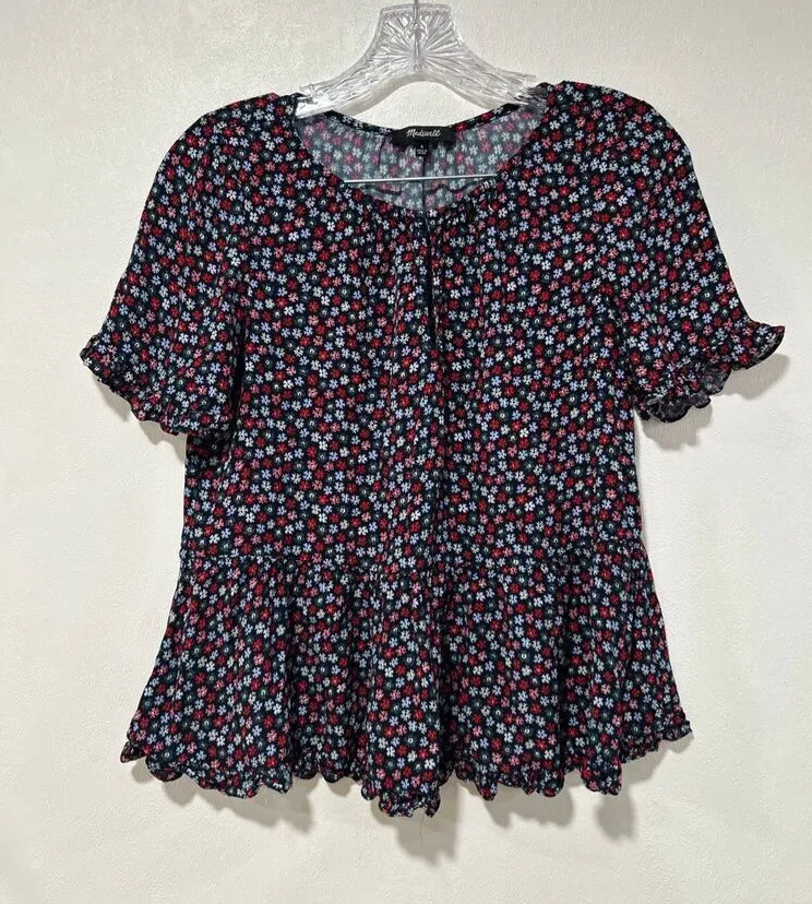 Madewell women’s blouse in size Small. Black base with red, lavender, and white floral print. Featur... Show more