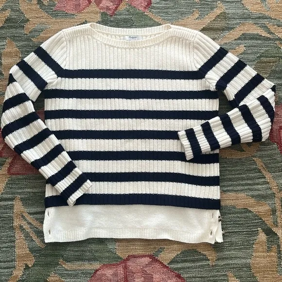Super soft and cozy navy and off white striped merino wool sweater, only worn a couple times no dama... Show more