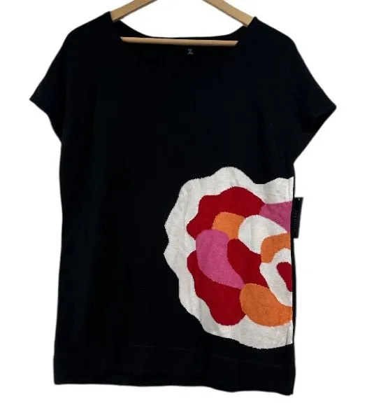 Stylish black top featuring a vibrant floral design. Perfect for any occasion. Madison sweater short sleeve xl NEW Floral Black Top soft knit cotton rayon blend Approx 27” long, 22” pit to pit Lightweight knit