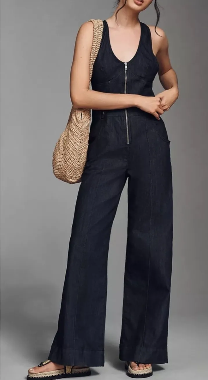 Maeve by Anthropologie dark wash denim jumpsuit with a sleek, modern silhouette. Designed with a flattering zip-front bodice, tailored waist with snap-tab accents, and a dramatic racerback for a sculpted, elevated look. Features wide straight legs, functional pockets, and subtle stretch for comfort while maintaining structure. A standout piece that effortlessly bridges casual and polished styling. Perfect styled with a crisp blouse, fitted tee, or worn solo with statement accessories for an elevated, fashion-forward outfit. Condition: Excellent pre-owned condition. No holes, stains, or flaws noted. Size: Tagged US 10 (UK 14 / EU 42) Measurements (approx., laid flat): • Pit to pit: ~16” • Waist: ~15.5” • Inseam: ~31” • Length (shoulder to hem): ~62” Details: • Brand: Maeve by Anthropologie • Dark wash denim • Zip front closure • Racerback design • Wide straight leg • Snap waist tab accents • Front & back pockets • 76% cotton / 23% polyester / 1% elastane • Made in Turkey A chic, architectural denim jumpsuit with a minimalist, elevated feel—easy to dress up or down year-round.