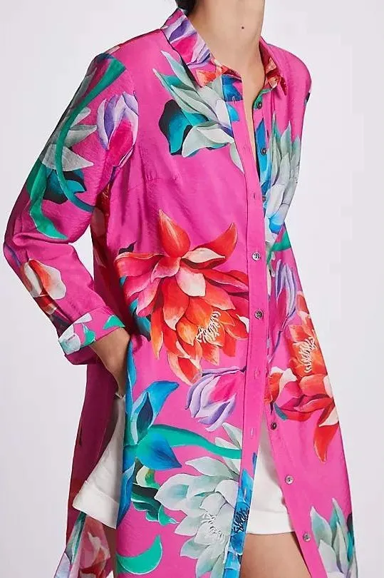 Stunning floral shirt dress from Maeve by Anthropologie, a standout piece that combines comfort with bold style. Featuring a vibrant pink background adorned with a colorful array of floral prints, this button-front dress offers a relaxed, oversized fit. Details include long sleeves with buttoned cuffs, a classic collar, and a gently curved hemline. Perfect for a casual daytime outing, a garden party, or as a chic cover-up at the beach. Style: Shirt Dress Dress Length: Midi Department: Women Sleeve Length: Long Sleeve Pattern: Floral Occasion: Casual Material: Viscose, Nylon Neckline: Collared Theme: Floral, Bohemian Fabric Type: Woven Season: Spring, Summer Closure: Button Keywords: Maeve, Anthropologie, Floral Dress, Shirt Dress, Plus Size, 3X, Boho, Bohemian, Oversized, Button Front, Long Sleeve, Statement Dress, Colorful Dress
