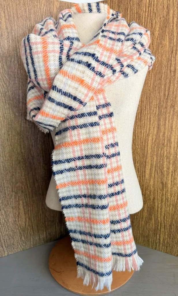 Maeve by Anthropologie oversized plaid scarf / wrap in a very soft, plush brushed polyester. Cream base with navy, coral, and blush striping and fringe ends. Approx. measurements: 30” wide x 76” long. Extremely soft and comfortable against the skin, lightweight yet cozy — easy to wear as a scarf, shawl, or wrap. Made in China. Hand wash, lay flat to dry. Excellent pre-owned condition