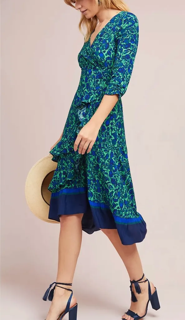Elegant floral midi dress in vibrant blue and green. Perfect for any occasion. SIZE: 0P FABRIC: pic... Show more