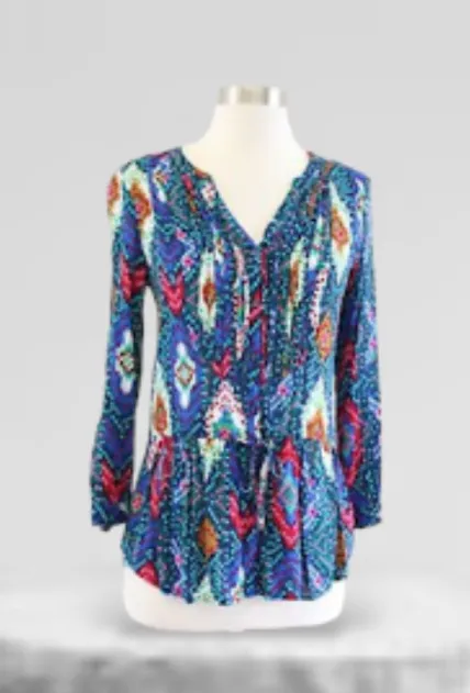 This beautiful Maeve Anthropologie top is a must-have addition to your wardrobe. The multicolor geometric ikat pattern gives it a bohemian and tribal vibe, making it perfect for any casual or party occasion. The blouse features a V-neckline, long sleeves with casual sleeves, and a button front closure. The tie waist adds a touch of elegance to the tunic style top. This rayon blouse is easy to care for, lightweight, and suitable for all seasons. This top comes in size 8 and is machine washable. Get this Maeve Anthropologie top and add a touch of elegance to your attire. C