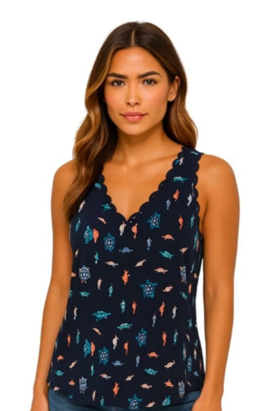 The MAEVE Anthropologie Turtle Terrapin Tank top in navy blue features a stylish animal print with a... Show more