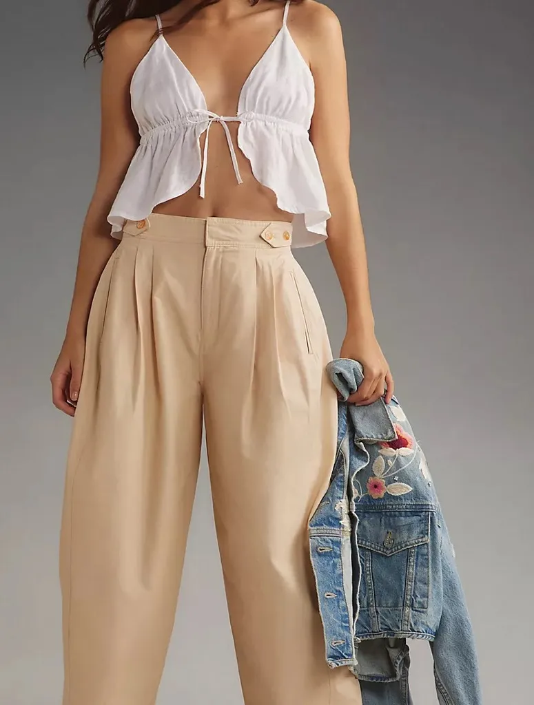 Great wide legged, high waist pants, barrel cut, pleated front, great neutral light tan color. Perf... Show more