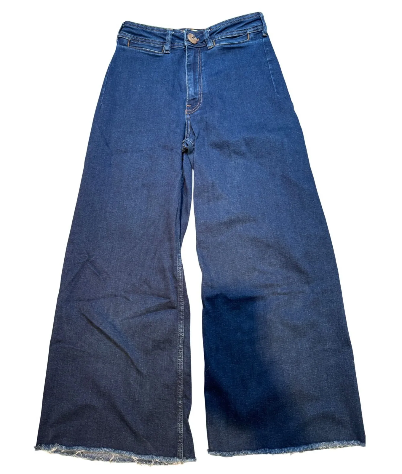 Embrace a chic silhouette with these Maeve by Anthropologie wide leg cropped jeans. The rich dark wash denim offers a timeless appeal, while the frayed hem adds a touch of modern flair. Designed for a flattering fit, these jeans are perfect for creating stylish outfits that transition effortlessly from day to night. Imagine yourself pairing them with a tucked-in blouse for a polished brunch look or a graphic tee for a casual weekend outing. Measurements: • Waist: 14 in Style: Wide-Leg Department: Women Fabric Wash: Dark Waist Size: 28 in Type: Jeans Accents: Fringe, Button Features: Pockets, Stretch Fit: Relaxed Pattern: Solid Rise: High (Greater than 10.5 in) Fabric Type: Denim Material: Cotton Blend Closure: Button Season: Spring, Summer, Fall Keywords: Maeve, Anthropologie, wide leg, cropped, denim, jeans, dark wash, frayed hem, high rise, casual, stylish, fashionable, everyday
