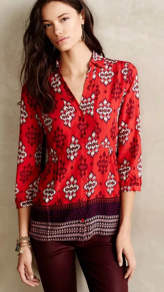 I’m selling a Maeve Anthropologie Woodland Walk Aztec Print Red Button Down Blouse Tunic Top Size 0 for $40. * Excellent condition * Lightweight * Button down * Three-quarter length sleeves with button cuffs * 100% Rayon * Machine wash cold Approximate measurements lying flat: * Pit to pit: 17.5” * Length from highest point of shoulder to hem: 25”
