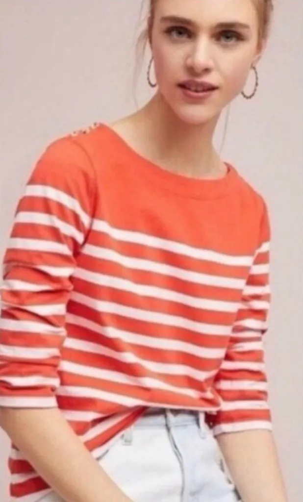 I’m selling a Maeve by Anthropologie Bonnie Orange & White Striped Boatneck Button Detail Tee Shirt... Show more