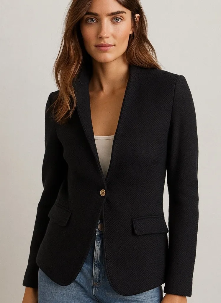 Elevate your wardrobe with this Maeve by Anthropologie black knit blazer, crafted from 100% cotton w... Show more