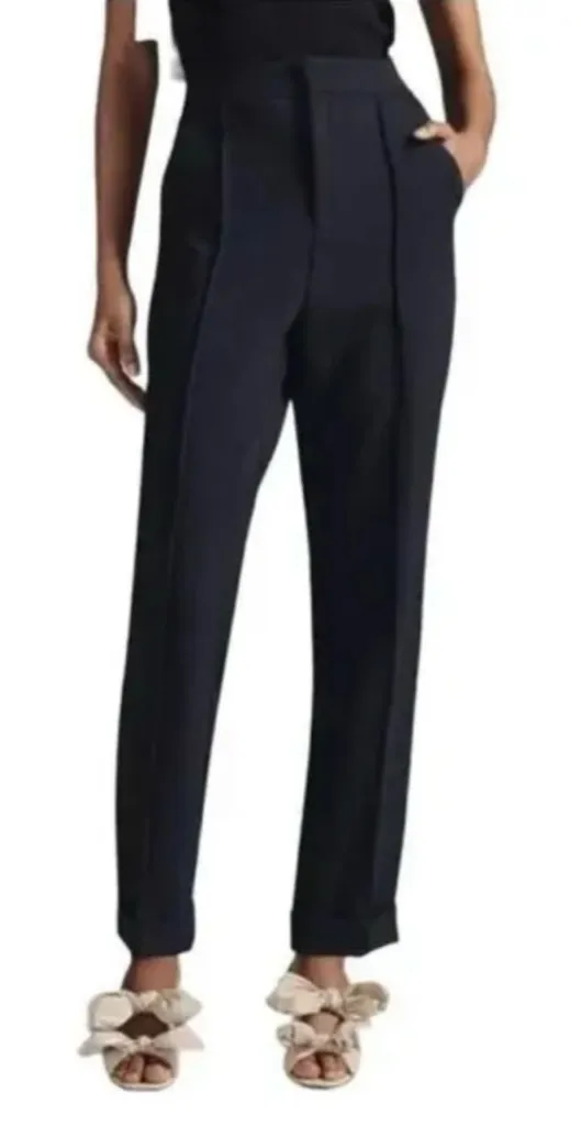 High waisted Straight tapered leg with cuffed hem Front slant pockets Back patch pockets Zipper w/ hook bar button closure 73% polyester/21% viscose/6% elastane Machine Wash in cold Approx Measurments: 14 3/4” waist when flat 12” rise 27” inseam 100825 1746