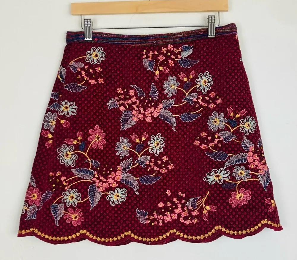 Maeve by Anthropologie heave brick red a line mini skirt. Scalloped hem. All over floral embroidery and embellishment throughout. Mini length. Size 10 Measurements: Waist: 15.5” Center back to hem: 18.5”