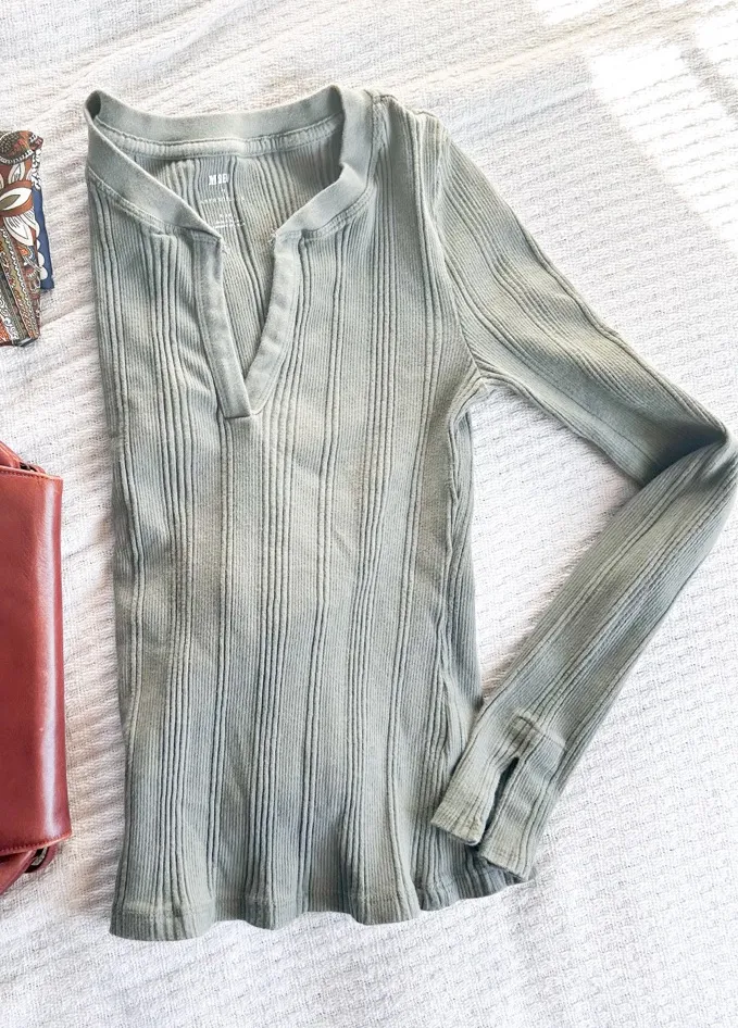 A staple top for fall and winter in a muted light mossy green. Flattering neckline with soft stretchy ribbed material. Perfect for throwing on with a pair of jeans and leather belt for a day out or with a pair of lounge pants for a day in. Size XS