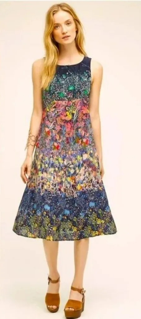 Maeve Multicolor Vibrant Floral 100% Silk Sleeveless Midi Dress - Size 0 Details: Button keyhole front Hidden zipper back Size 0 Shell: 100% silk Chest lining: 100% poly Measurements: Pit to pit: 16.5 inches Length: 42.5 inches Tags: abstract garden party artsy bright cocktail prairiecore wedding guest summer spring striking sleeveless anthropologie movement