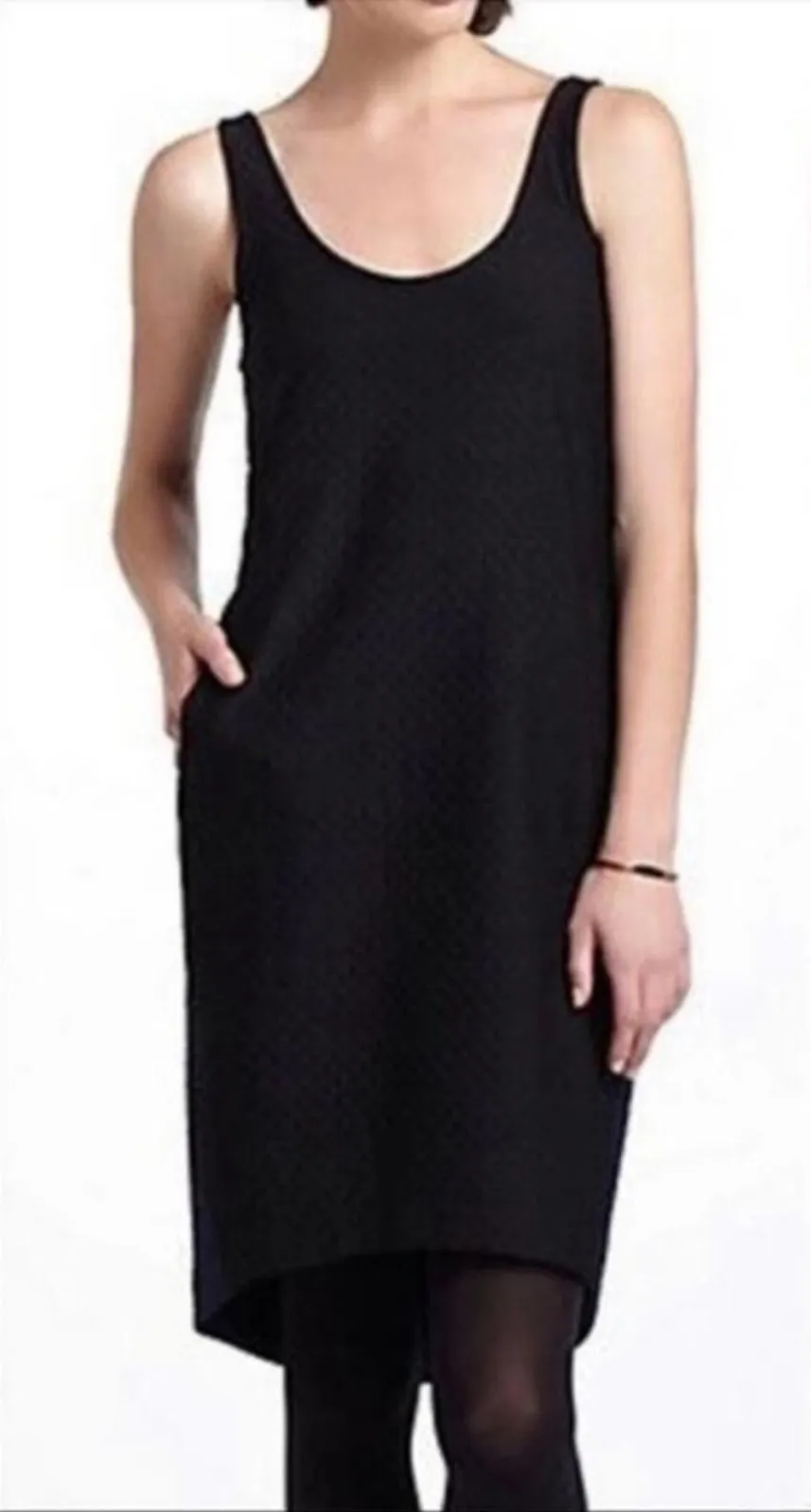 Stylish Maeve Sidelong dress in size XS, featuring a unique seared two-tone waffle knit design with black front and blue back. Wide fixed straps, scoop neck and back with elastic gathering ensure comfort. Practical seam pockets and flattering hi-low silhouette. Made from 98% polyester, 2% spandex. Machine washable. Perfect for business casual, office, dinner, party, wedding guest, and professional settings. Model photo for fit reference only. Measurements (approximate, flat lay): Pit to pit: 15” | Front length: 34.5” | Back length: 37” Business Casual, Office Dress, Dinner Dress, Party Dress, Wedding Guest, Professional, Classic, Contemporary, Minimalist