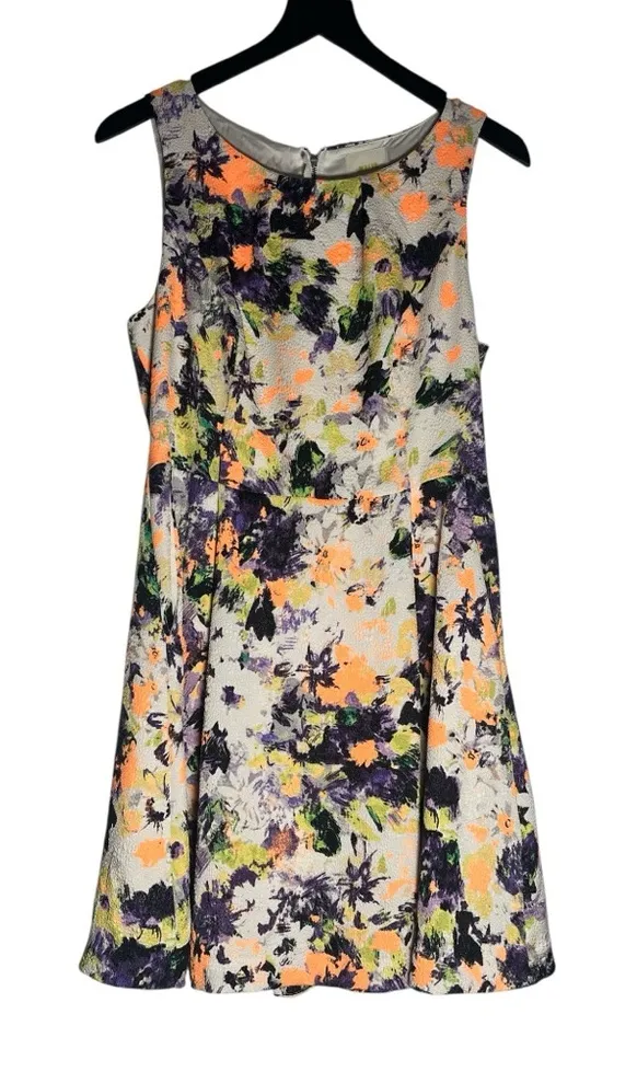 Floral watercolor print (shades of purple, yellow, green and neon orange) textured fabric Sleeveless Round neck Fit & flare silhouette Fitted bodice with A-line skirt Side pockets Exposed back zipper Fully lined Bohemian Feminine Floral Frenzy