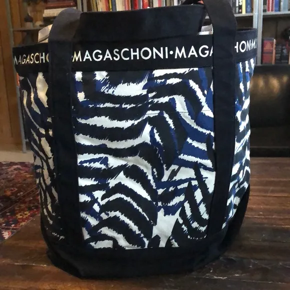 NWOT Heavy canvas tote bag in stylish tan, black and royal blue graphic print. Perfect for shopping in style, a carryall bag for a day in town, antiquing, or hanging at the beach. Interior zip pocket for keys, wallet, phone. Approximate measurements: 14” tall x 17” wide with 6.5” depth