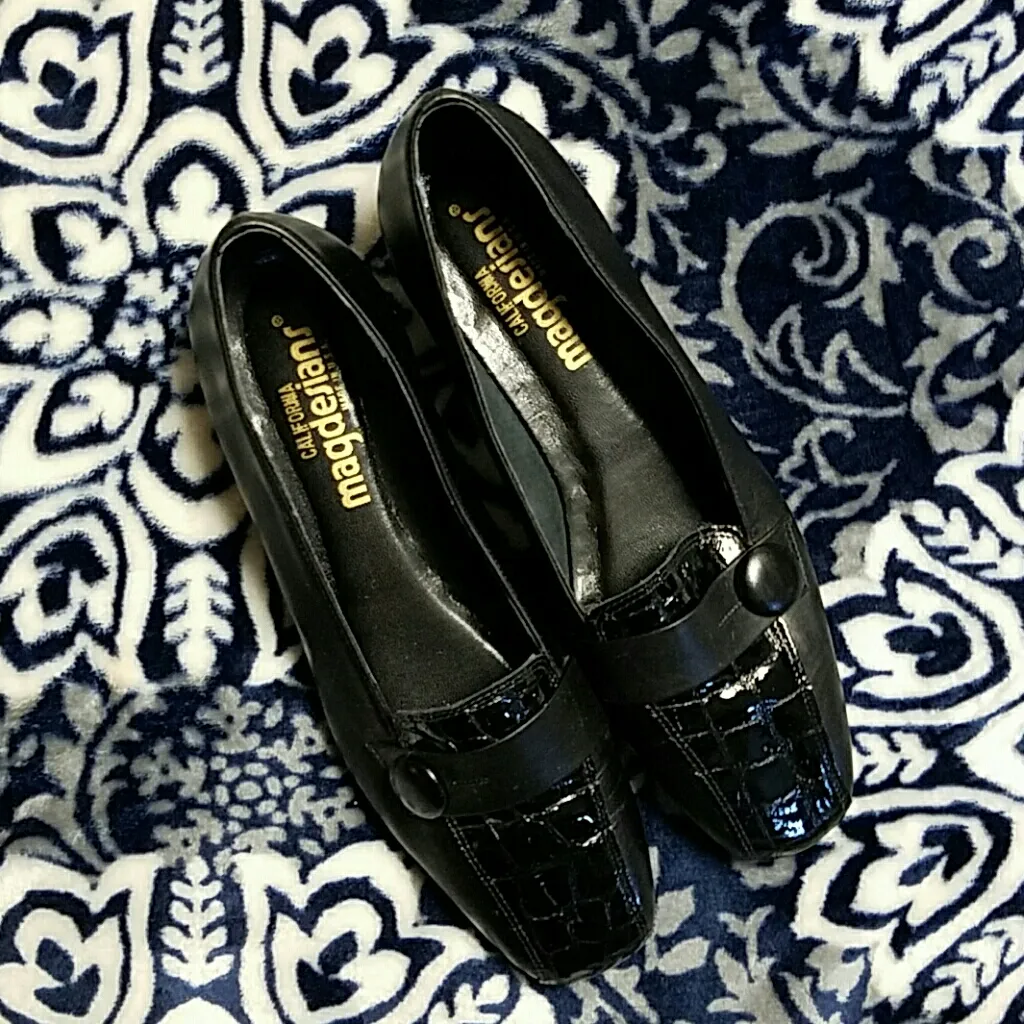 Beautiful black Patent and satin Flats. Embossed crocodile toe. Sweet faux button detail. Size 8 1/2 M. Magdesians California Made in the USA. Perfect for the holidays. (Binamz)