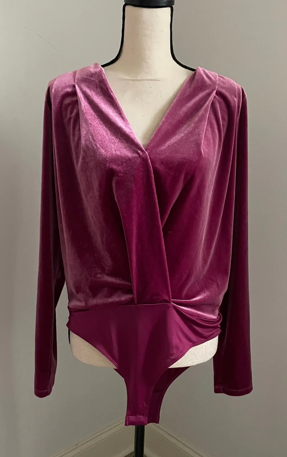 Measurements: • Bust: 20 in • Length: 29 in • Waist: 14 in Department: Women Style: Shaping Top Type: Bodysuit Fabric Type: Velvet Compression Area: Abdomen Material: Polyester, Spandex Features: Stretch, Plunge Number in Pack: 1 Pack Pattern: Solid Accents: Button Underwire Type: Wireless Opacity: Opaque Garment Care: Hand Wash Only Country of Origin: China Keywords: velvet bodysuit, wrap top, plunging neckline, ruched detail, long sleeve, snap bodysuit, evening wear, party top, elegant, sophisticated, going out, date night, fall fashion, winter style, #velvet #luxury #vamp #valentinesday #valentinesoutfit Magenta Velvet Bodysuit size Large Plum Long Sleeve Snap Closure V-Neck Luxury