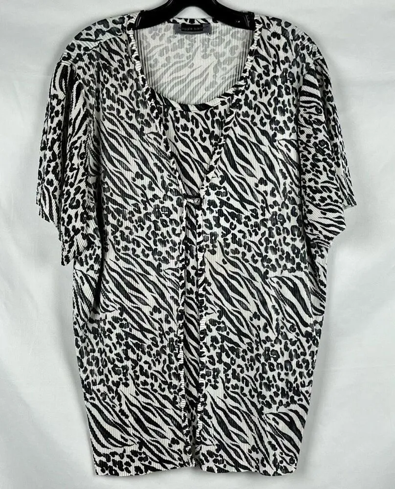 Maggie Barnes Stretch Zebra Leopard Short Sleeve Cardigan with Built in Top. The size tag has been cut out of the blouse. Please check measurements in photos before purchasing for size accuracy. There are some loose strings and snags in the blouse. Please see all photos. Measurements in photos. In good, pre-loved (used) condition. Comes from a smoke free home. Actual color may vary due to differences in lighting and computer monitor/cell phone screens.
