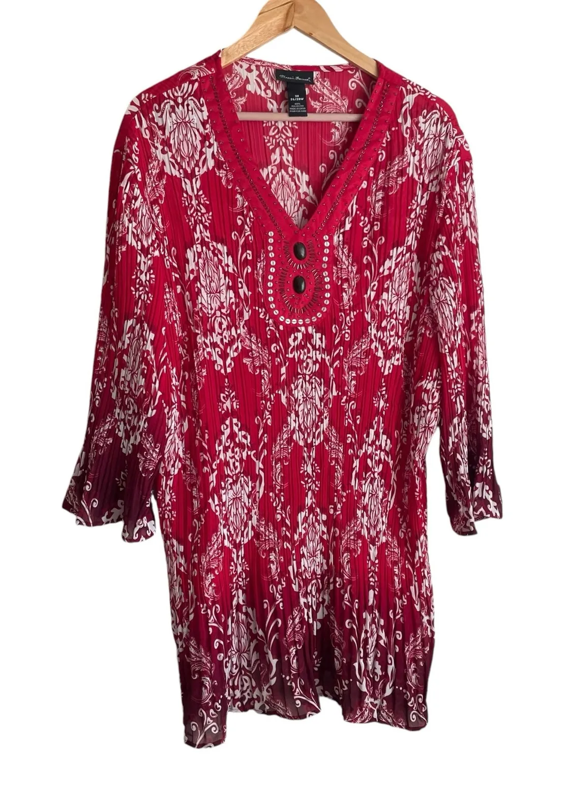 Maggie Barnes Women Top 3X Red Damask Print Crinkle Beaded Dressy Mature Office Well cared for cond... Show more