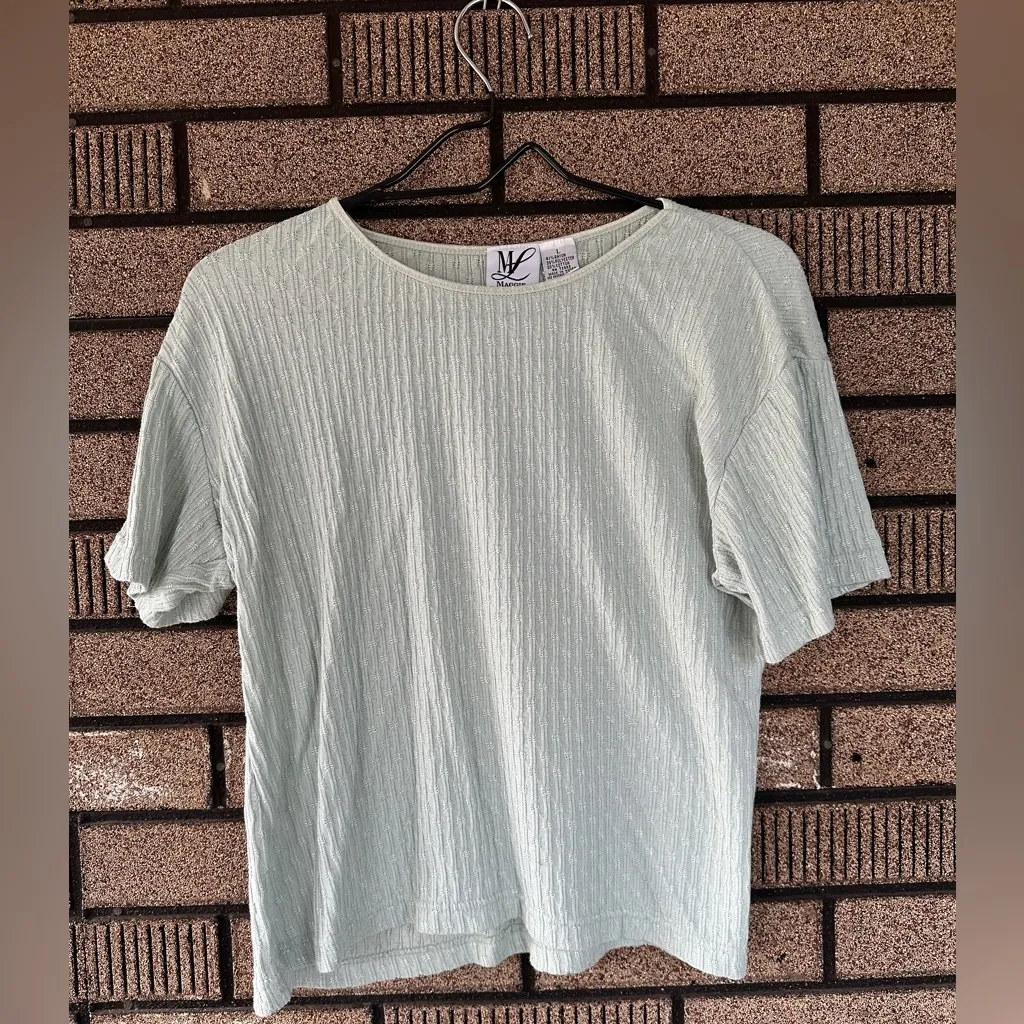 Vintage Maggie Lawrence short sleeve top with subtle shimmer. • Size: Large (see measurements) • Color: Pale mint green with silver metallic thread detail • Fabric: 41% Rayon / 39% Polyester / 20% Cotton • Textured vertical knit pattern with small floral-like details • Lightweight, slightly stretchy, drapes well • Made in Korea – quality vintage construction • Gently worn Measurements Bust 42” Waist 37” Length 19.5” Perfect with trousers, skirts, or jeans for a timeless look. Smoke-free home, ships fast.