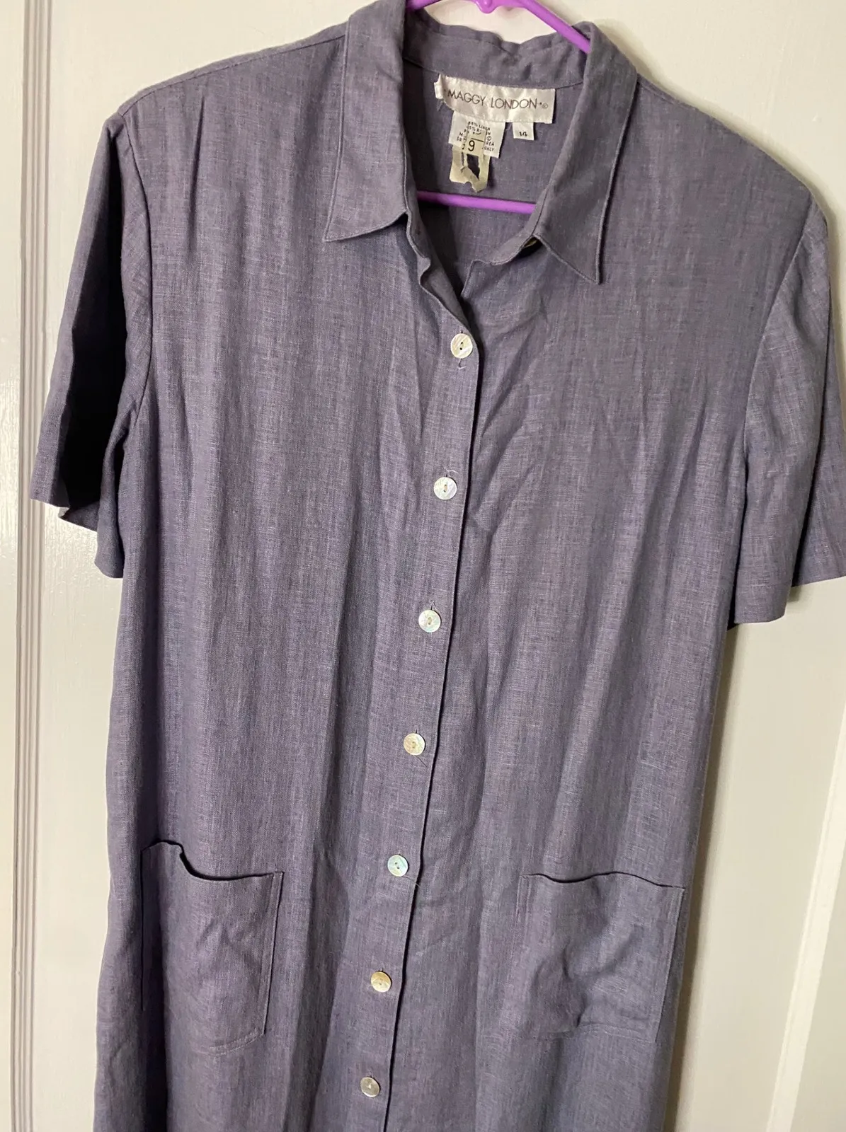 Pit to pit 22" Waist 21" measured flat hips approx 25" Length 48.5" Has shoulder pads Style: Shirt Dress Dress Length: Midi Department: Women Sleeve Length: Short Sleeve Pattern: Solid Occasion: Casual, Workwear, Business Material: Linen, Rayon Neckline: Collared Theme: Retro, Minimalist Style, Vintage Core Fabric Type: Woven Season: Spring, Summer, Fall Sleeve Type: Cap Sleeve Closure: Button Keywords: Maggy London, Linen Dress, Shirt Dress, Midi Dress, Button Front, Pockets, Purple Dress, Linen Blend, Vintage, Classic, Work Dress, Casual Dress, Size 14 P-351