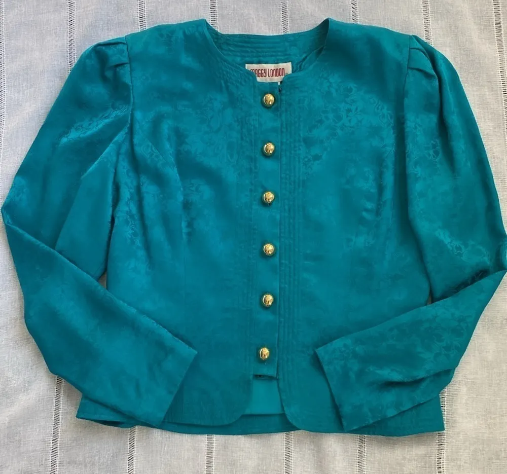 Maggie London’s 80s silk blazer, adorned with gold buttons in a captivating deep turquoise, is a stu... Show more