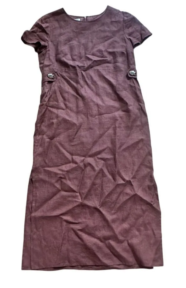 Elevate your wardrobe with this charming Maggy London petite dress in a sophisticated mauve hue. Crafted from 100% pure linen, this dress offers exceptional breathability and a naturally textured finish that becomes more beautiful with wear. The understated silhouette features cap sleeves and a classic crew neckline, while whimsical fish-shaped button details at the sides add a playful, distinctive touch. The straight cut creates a flattering, streamlined look that works beautifully for both professional settings and casual occasions. Slight tear on one of the slits, about 1" long. Keywords: linen dress, mauve dress, Maggy London, petite dress, cap sleeve dress, fish button, summer dress, professional dress, straight cut dress, casual dress, office wear, breathable dress We ship same day. If you have any questions about the item feel free to reach out. Thank you!