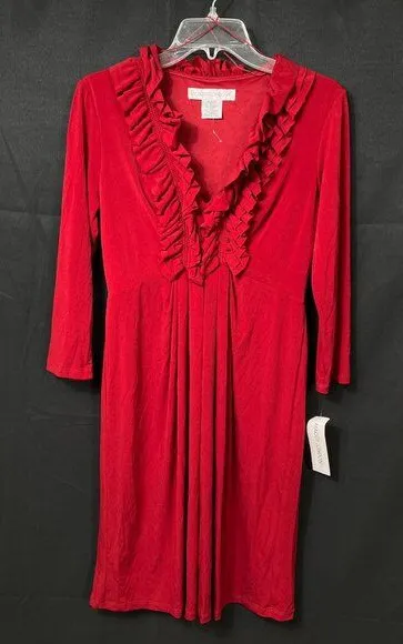 This elegant Maggy London dress features a stylish ruffle V-neck design and a flattering silhouette, making it suitable for various professional settings. Its comfortable polyester/spandex blend ensures a fit that moves with you, while the vibrant red color adds a touch of sophistication to your wardrobe. SKU 7612 • Ruffle V-neck • 3/4 sleeves • Knee-length • Comfortable stretch fabric • Easy care instructions Size: 10 Condition: New With Tags This item has been cleaned, sanitized and deodorized. Although we clean our items additional cleaning may be needed such as spot treatments, etc.
